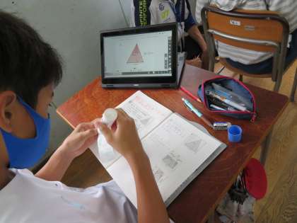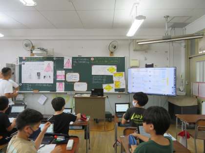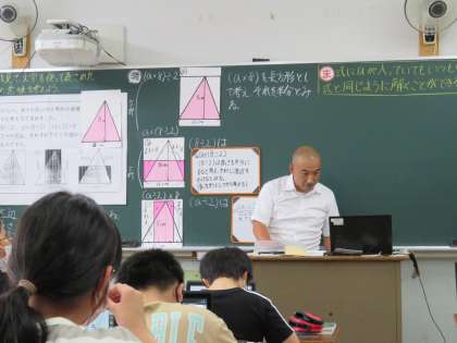 算数の学習で、三角形の面積を文字を使って表す方法をみんなで考えました。