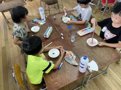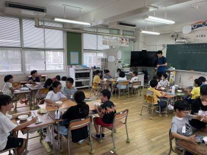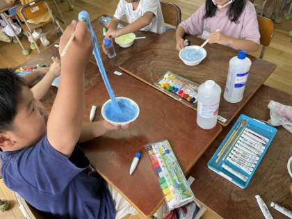 スライムをつくりました。算数の「かさ」の学習で習った「ミリリットル」を使って洗濯のりをはかったり、スライムの感触を楽しんだりしました。