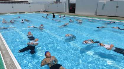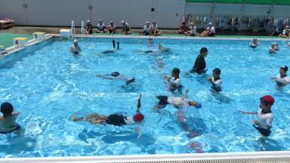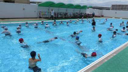 その後、万一溺れそうになった時に身近なもので浮くことができることを、ペットボトルを用いて体験しました。命を守るための学習として、子どもたちは真剣に取り組んでいました。