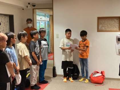 開舎式を行いました。司会者の進行で進めました。宿舎「ホテルやまとよ」の方からごあいさつをいただきました。施設での活動が始まりました。