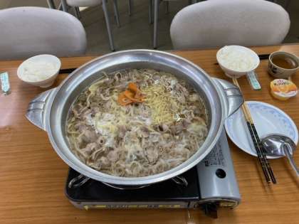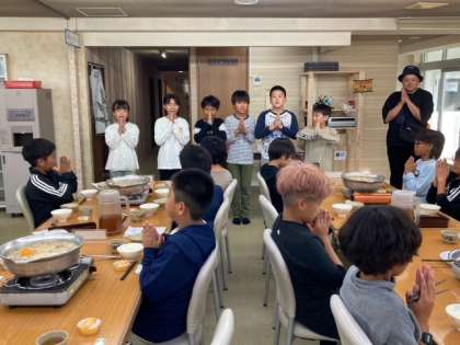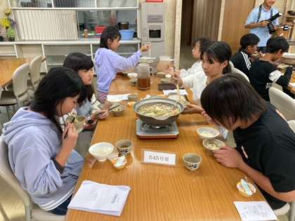 楽しみにしていた夕食の始まりです。班ごとにお鍋を囲みました。取り箸を使って好みの具材をいただきます。お腹が減っていたのかすべてのお鍋が完食でした。「ごちそうさまでした」。