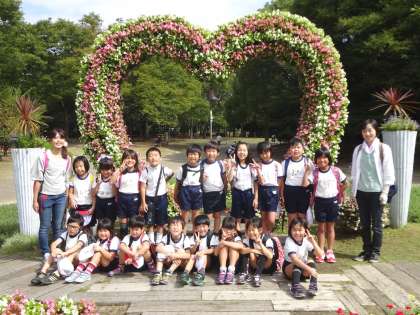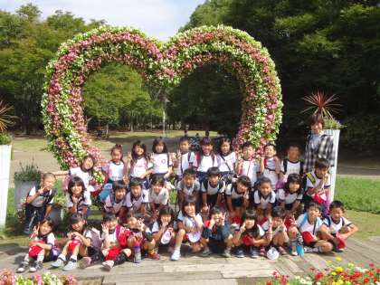 ハートの花のアーチをバックに集合写真を撮りました。