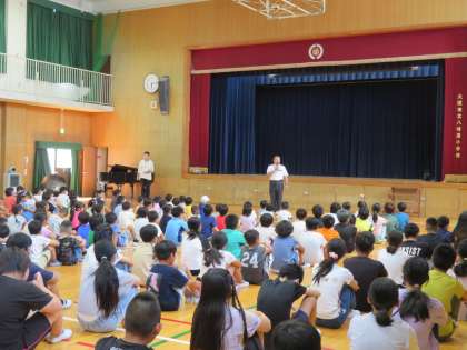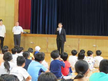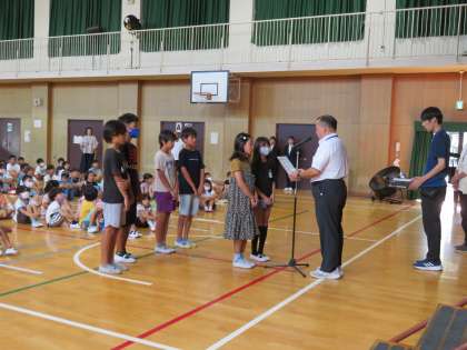 8月28日(月)、新しく八幡屋小に加わった教職員と教育実習生を紹介し、始業式を行いました。夏休み、活躍した子どもたちの表彰も行いました。