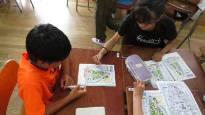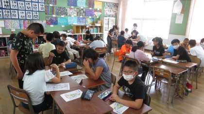 6年生は、修学旅行の活動班で話し合いを行いました。平和学習の時にどのように班でフィールドワークをするのかを、地図を見ながら計画を立てていました。