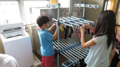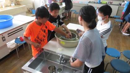 家庭科の時間に自分の靴下を洗濯しました。たらいに水をため、