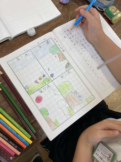 4年生は、まど・みちおさんの詩「よかったなあ」を読み、連ごとに読み取った風景を挿絵にして表しました。