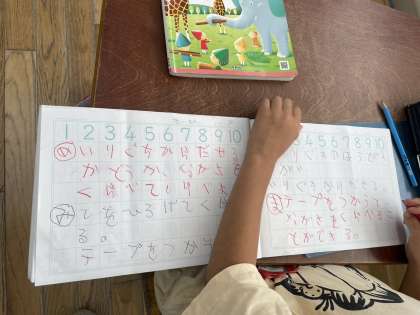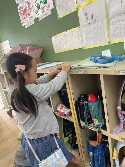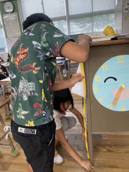 テープを使って、机の幅とドアの幅を比べたり、先生の机の高さとロッカーの高さを比べたりしました。