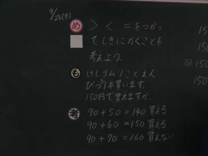 数の大小を>、<、=で表しました。