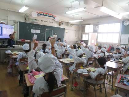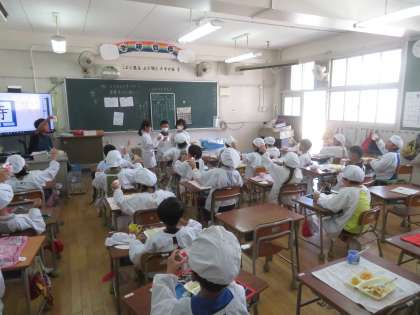 2年1組では、給食の時間に誕生日のお友達がいたら、お誕生日係が前に出てみんなで牛乳で乾杯をしてお祝いします。