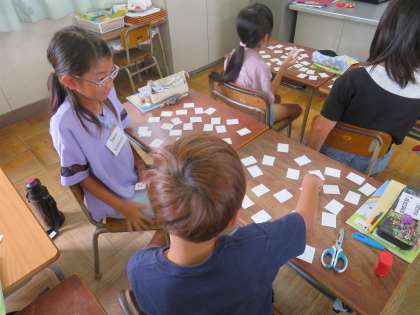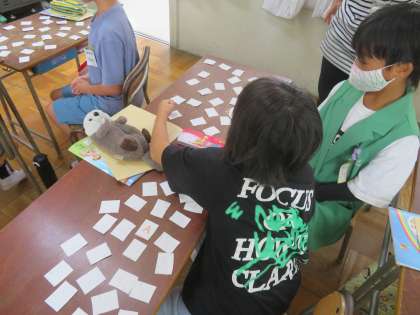 真剣衰弱を通して、アルファベットの順番について学習しました。アルファベットがそろったら読み方を声に出して楽しみにながら学習することができました。