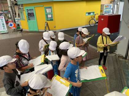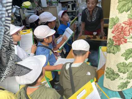 町たんけんで商店街の築瀬商店さん、光文具さん、お好み焼き屋のボタンさんにインタビューをしました。