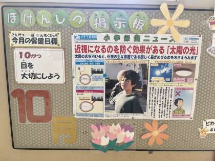 10月のほけんしつ掲示板です。10月10日は目の愛護デーです。目の健康について考えるよい機会ですね。