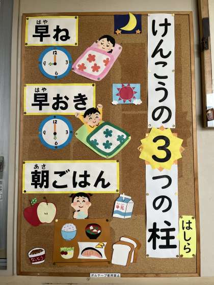 また、玄関の掲示板が新しくなりました。健康の3つの柱「早寝・早起き・朝ごはん」を大切に、健やかな日々を過ごしましょう。