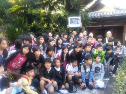 左:西光寺で記念写真 右:観音寺小学校との交流会