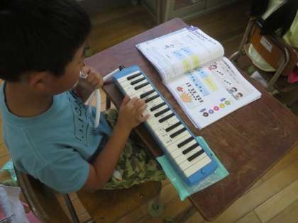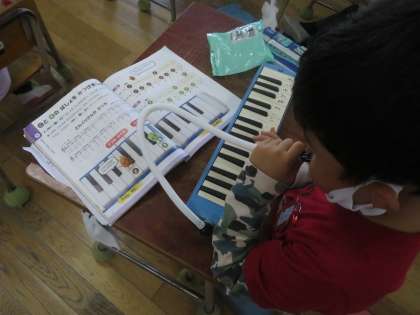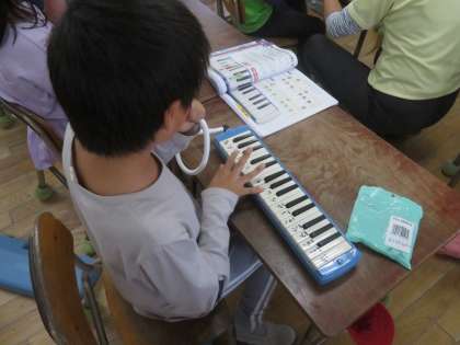 けんばんハーモニカをふきました。その後、やまびこごっこを大きな声で歌いました。