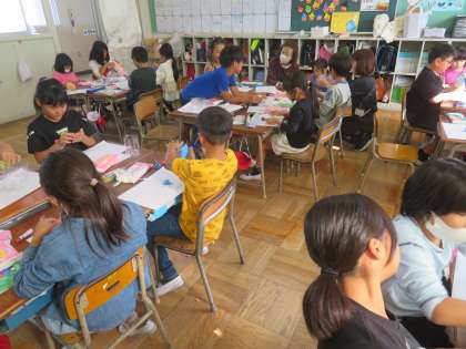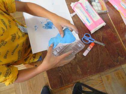 ペットボトルに紙粘土を張り付け、オリジナルのペン立てを作りました。自分の好きな色やデザインを考えて作成することができました。