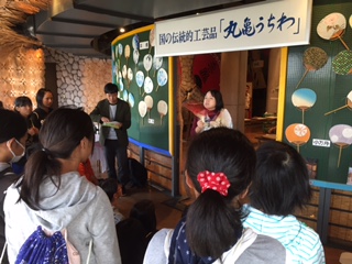 丸亀市に到着し、「うちわミュージアム」で名産のうちわづくりをしています。図案は学校で児童が描いたものを持って行っています。