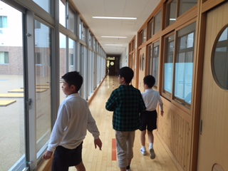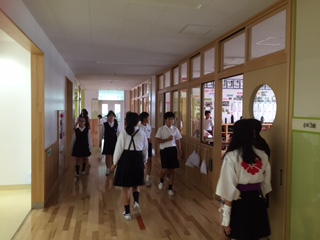 交流会の後、少人数に分かれて、観音寺小学校の児童にきれいな校内を案内してもらいながら、自己紹介や自由な話をして交流を深めました。