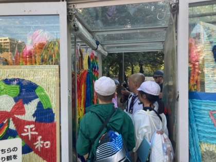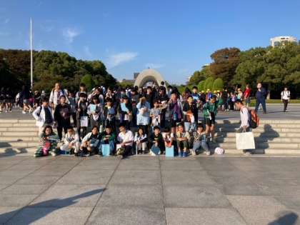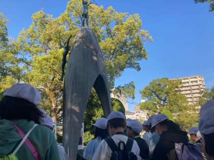 資料館の見学を終え、平和記念公園を巡りました。原爆の子の像前では黙祷し、みんなで思いを込めて折った千羽鶴を納めました。