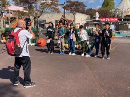 遊園地に入りました。学級写真、活動班での写真を撮って、出発です。班で相談してアトラクションを楽しみます。
