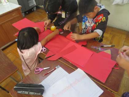学習発表会の準備をしました。班ごとに分かれて各自担当のものを周りの友だちと協力しながら作業することができました。