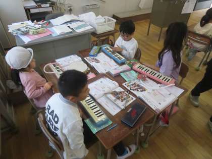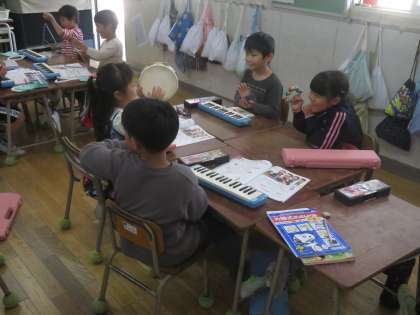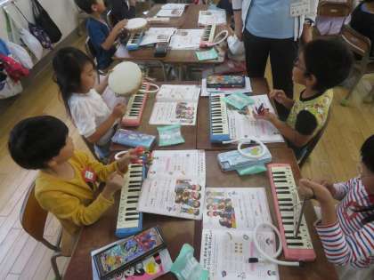 音楽に合わせてカスタネット、タンブリン、トライアングル、けんばんハーモニカを演奏しました。
