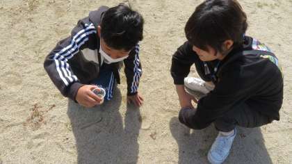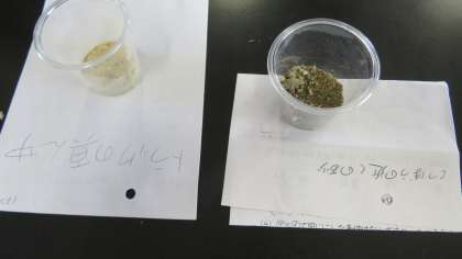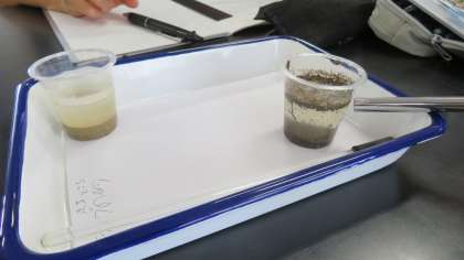 今回は学校の様々な場所の土を集めて水と混ぜ、水と土がどうなるのかを調べました。