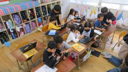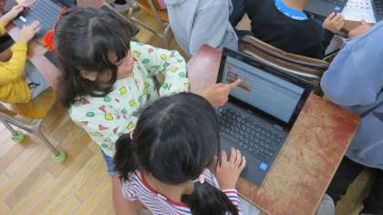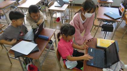 6年生が学活の時間に1年生の教室に行き、1年生の子どもたちにパソコンの操作の仕方を説明しました。デジタルドリルの学習の仕方や、心の天気の記入の仕方を丁寧に教える様子が見られました。