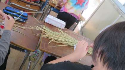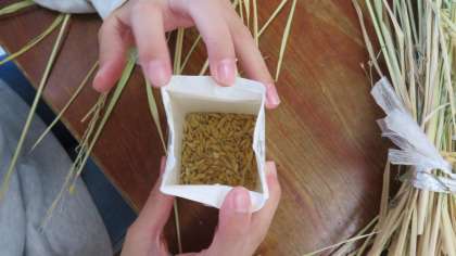 田んぼに植えた稲がたくさん実り、今日は教室で脱穀を行いました。牛乳パックなどを利用して、稲穂からお米を丁寧にとっていきました。