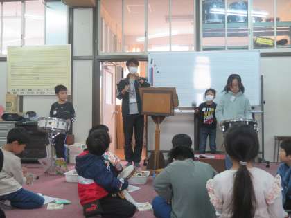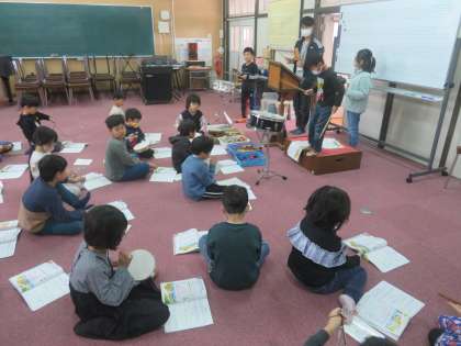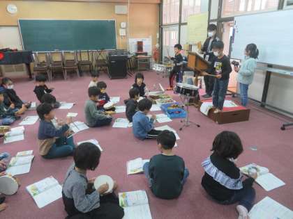 音楽に合わせていろいろな楽器を演奏しました。タンブリン、鈴、トライアングル、小太鼓、マラカス、ウッドブロックを演奏しました。