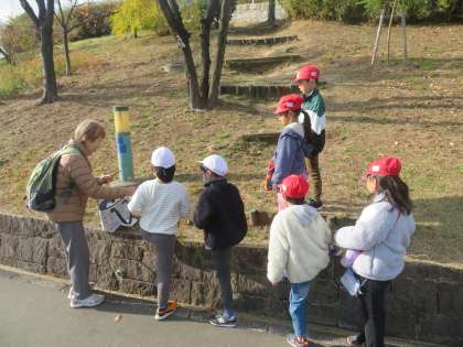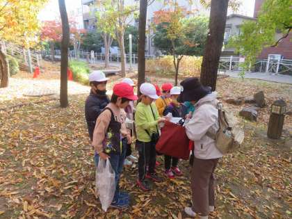 1・2年生で八幡屋公園に秋みつけに行きました。シニア大学の方に自然のことについて、いろいろと教えていただきました。紅葉した落ち葉やどんぐりもたくさん拾いました。
