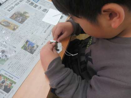学校に帰ってきたら、クラフト体験をしました。1年生はどんぐりのストラップを、2年生はクマのストラップを作りました。
