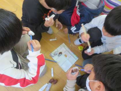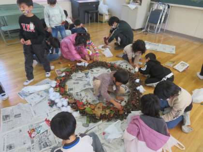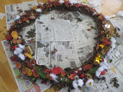 以前収穫したサツマイモのつると、秋みつけでみつけた落ち葉やドングリを使って、巨大なクリスマスリースを作りました。