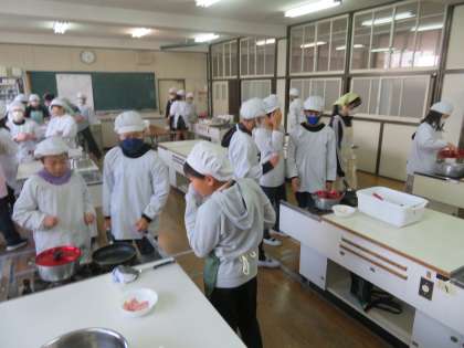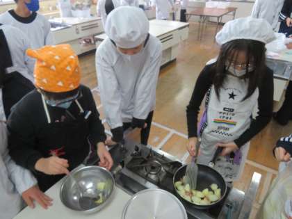 6年生は調理実習を行い、ジャーマンポテトを作りました。ジャガイモの皮をむき、下茹でしたものをベーコンと一緒に炒め、塩・コショウで味付けをしました。どの班も手際よく準備から片付けまで取り組むことができました。