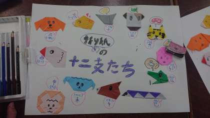 折り紙の十二支が完成しました。友だちの作品も見て感想を伝えあいました。