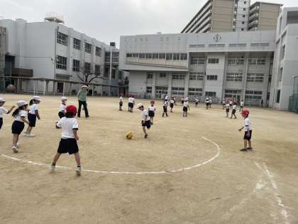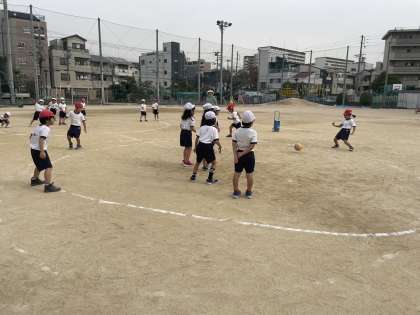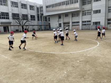 円の中にいる人を、外の人がボールを投げてあてる活動をしました。円の中にいる人は、ボールを触れません。