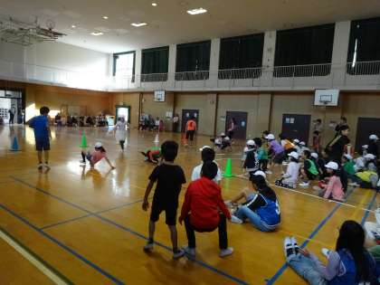 「あそび大会」で「讃岐弁クイズ」や「ミニ運動会」で楽しく交流しました。