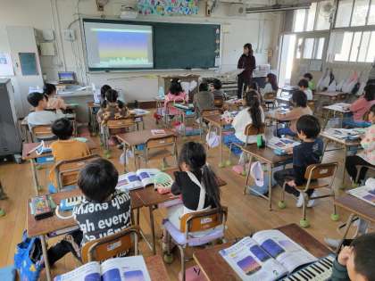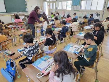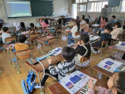 「きらきらぼし」を歌ったり、鍵盤ハーモニカで演奏したりしました。その後、いろいろな楽器を使って、星空の様子を表す音楽をつくりました。