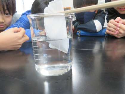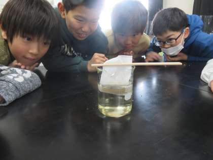 身近な食塩や砂糖がどのように水に溶けていくのかを観察しました。「なんか糸みたいなものが出ている」「水の色が砂糖のほうは変わった」などしっかりと子どもたちは観察することができていました。