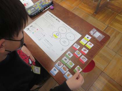 一日を元気に過ごすための朝食の選び方について学習しました。自分で好きなメニューの朝食を考え、朝食を食べることの大切さを知りました。