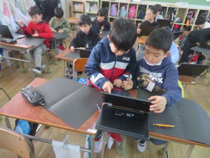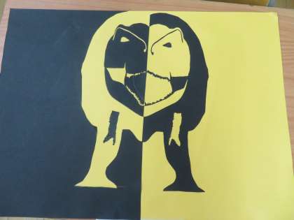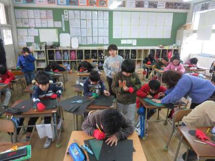 ネガ・ポジという反転切り絵をしました。好きな動物や果物、その他にも節分が近いので鬼を作っている児童もいました。
