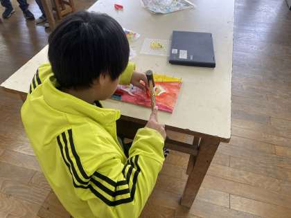 「くぎうちビー玉」でどこに釘を打てば入るかなど考えながら作っていました。完成した子から友だち同士で交換してゲームを楽しんでいました。