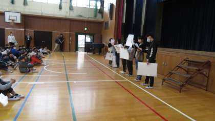 今週は手洗い・うがいを全校ですすんで取り組む手洗い週間です。健康美化委員会の児童がクイズを出してみんなに手洗いの大切さを伝えました。まだまだ、かぜ等疾患に注意が必要です。みんなでしっかりと手洗い・うがいをしていきましょう。