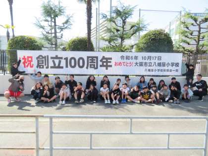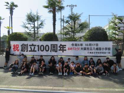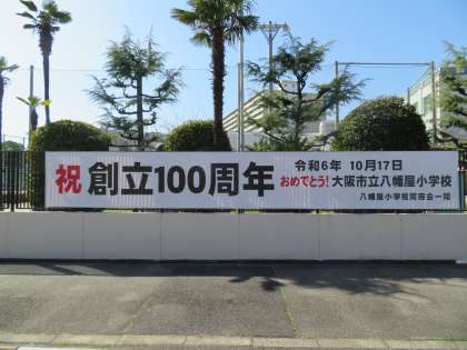 八幡屋小学校は、今年の10月17日に創立100周年を迎えます。記念事業として、PTAや地域の方々のご協力をたくさんいただいています。今回は「八幡屋小学校同窓会」のみなさんから、立派な横断幕をいただきました。本日から本校北門付近に掲示をしています。