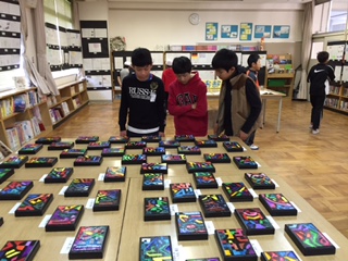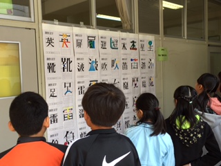 上段:美術の作品の見学をしました。イメージを漢字の一部にするとおもしろいですね。