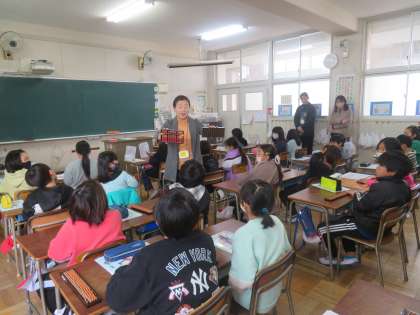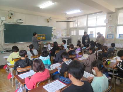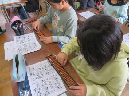 「そろばん教室」がありました。講師の方に来ていただき、そろばんの使い方から計算の仕方まで教えていただきました。人差し指と親指を使って玉をはじき、簡単な足し算や引き算の計算をすることができました。