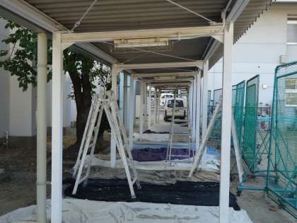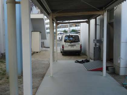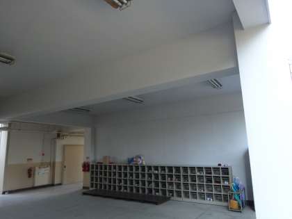 講堂前ピロティの塗装が完了し、明るくなりました。きれいになって逆に目立っている古い照明器具は、業者に交換してもらう予定にしています。