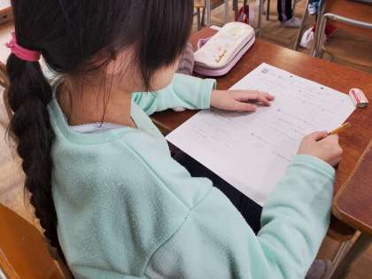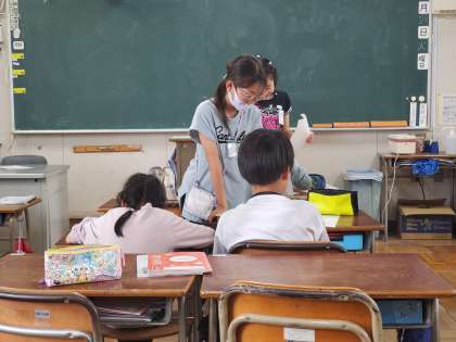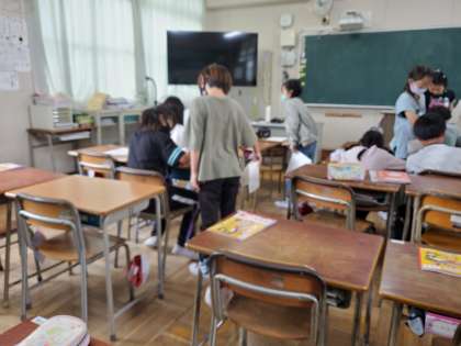テスト直しをしました。わからないところは、子どもたちがミニ先生になって教えました。