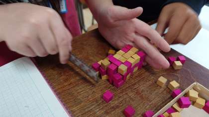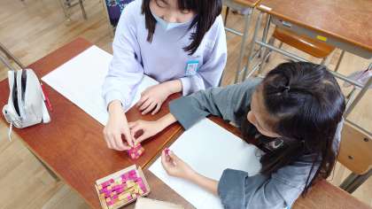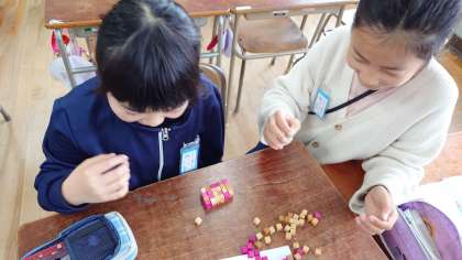 体積の学習をしました。1㎤の小さな立方体がいくつあるか数えるときは、たて×横×高さ の計算をすれば早く数えられることに気が付きました。