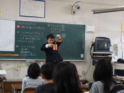 「少数 はしたの大きさの表し方を考えよう」の単元の研究授業をしました。児童が理解しやすいように色のついた水やタブレット・プロジェクターも使って、少数のたしざんのしかたを学習しました。今回は新任研修として、放課後討議会も行われました。